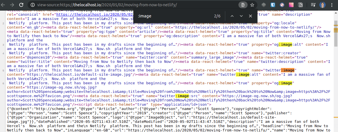 1https://image-og.now.sh/og.jpg2 ?author=Scott%20Spence3 &website=scottspence.com4 &title=Serverless%20OG%20Image%20Example%20Card5 &image=https%3A%2F%2Fscottspence.me%2Ffavicon.pngGetting & instead of & so if you copy paste this link into a