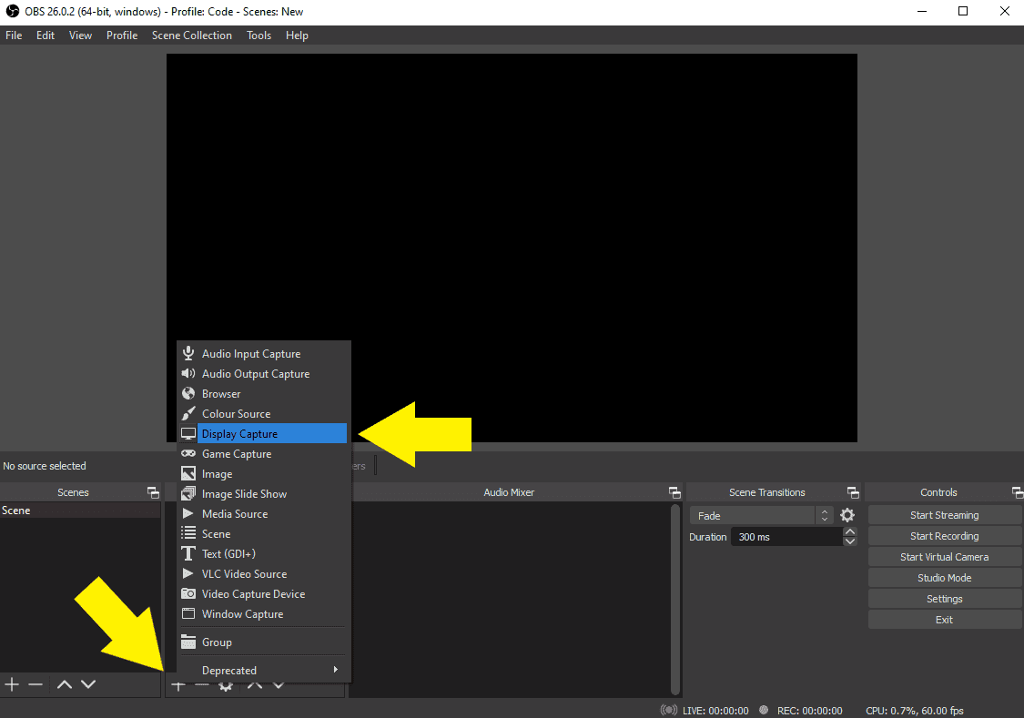 For the very basics you’re going to need a scene with a display capture.