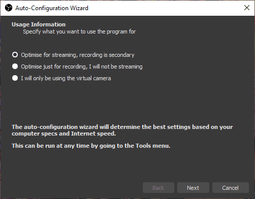 When you first open OBS after downloading it you’re prompted to use the Auto-Configuration Wizard which will determine the best settings based on your hardware and internet speed.