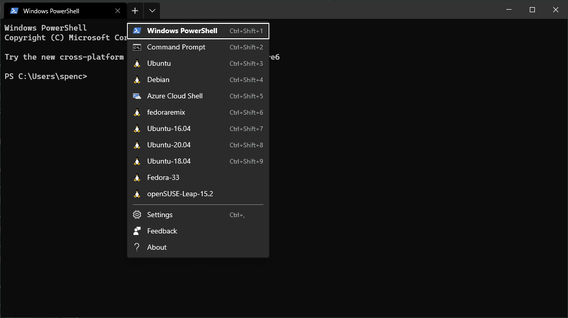 ℹ To see what available shells you have you can use Ctrl+Shift+Space Bar which will activate the dropdown which will show all available shells.