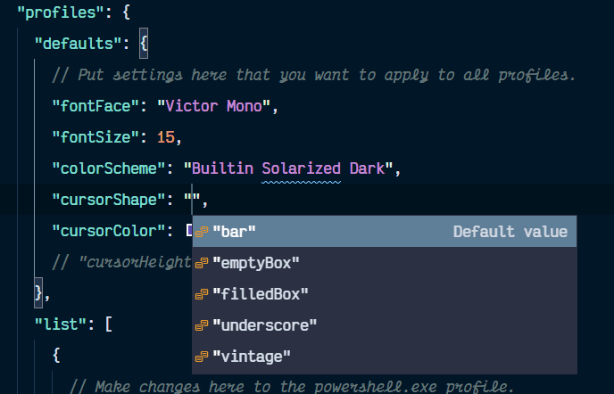 1"profiles": {2 "defaults": {3 // Put settings here that you want to apply to all profiles.4 "fontFace": "Victor Mono",5 "fontSize": 15,6 "colorScheme": "Tango Dark",7 "cursorShape": "filledBox",8 "cursorColor": "#639"9 // "cursorHeight": 85 // use with vintage cursorShape10 }11}ℹ I discovered the additional cursor options by hitting Ctrl+space bar to bring up the intellisense options: